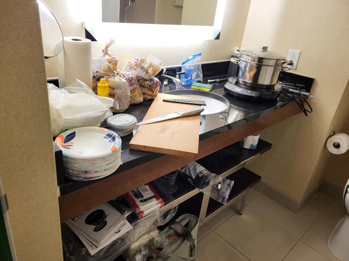 A hotel bathroom is the second best place to do this (the first best being an actual kitchenette). Holding a smoke meat party inside a single room instead of a double-room (two bathrooms) means you're serving food and drink without a functional bathroom. Not ideal.